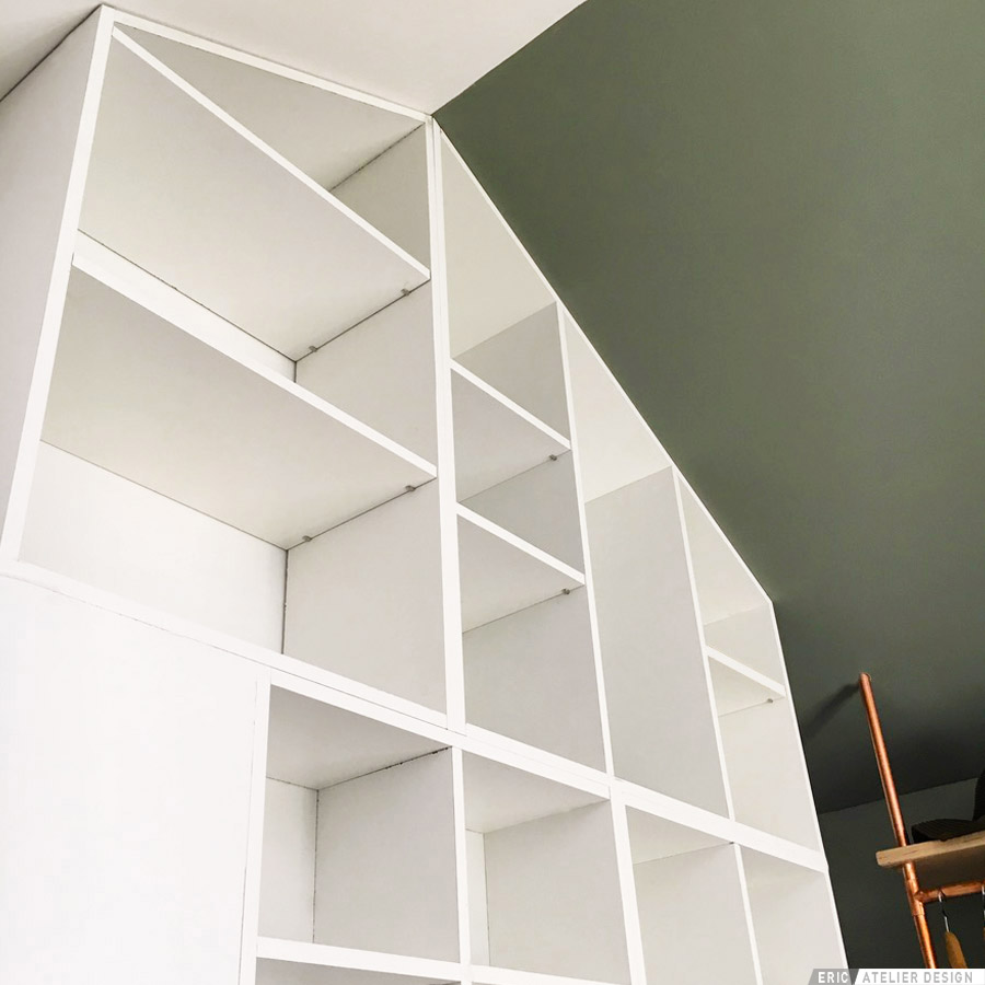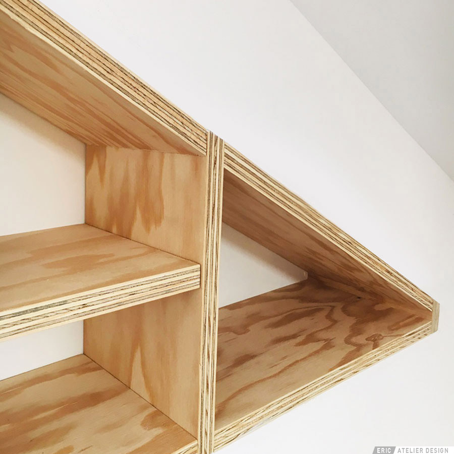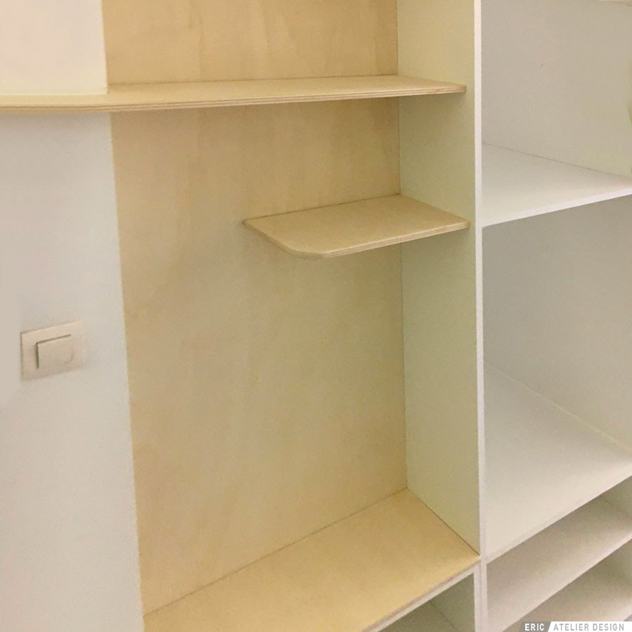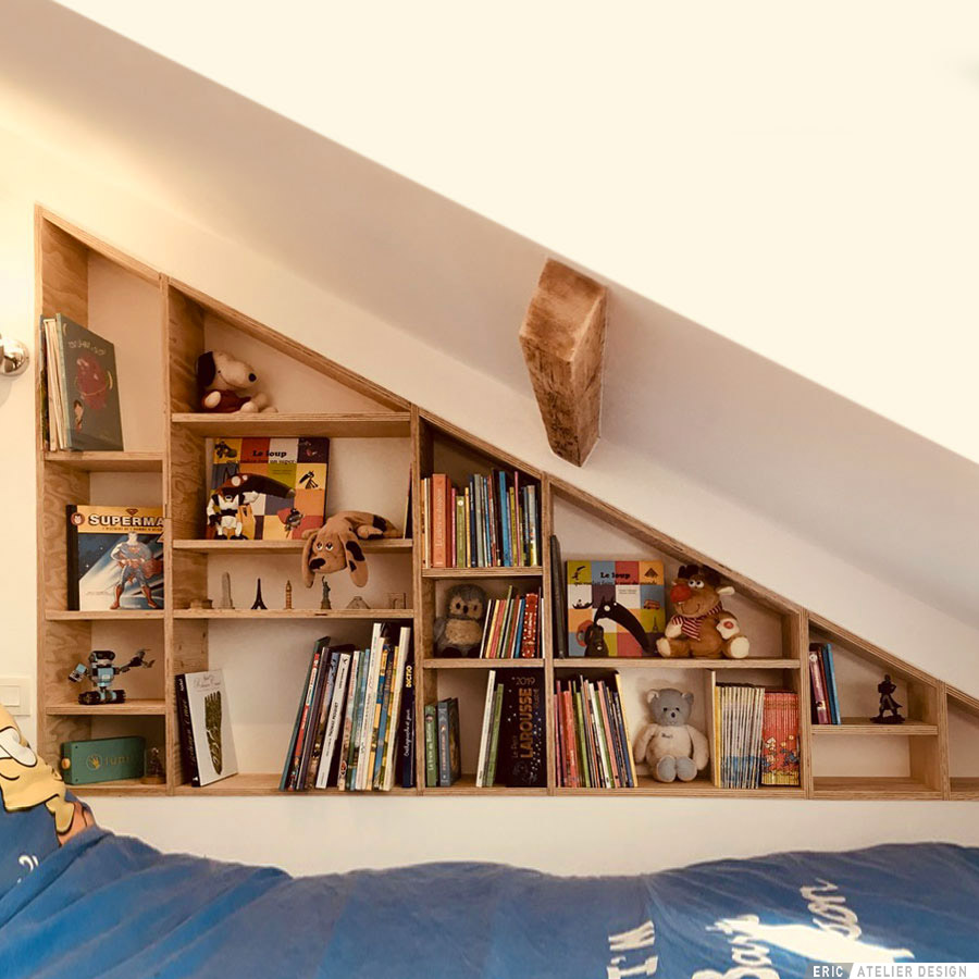 Chaud et texturé, il va accentuer la profondeur de la niche, en contraste avec la finition du mur. En réalisant cet élément sur le chantier afin d'ajuster au mieux les découpes, j'ai pu adapter la hauteur de chaque tablette selon les dimensions précises de la collection de livres, BD, et doudous qui y trouveront leur place, ce qui apporte une asymétrie que je trouve intèressante. L'assemblage chevillé-collé permet un rendu sans aucune vis apparente. En finition, le bois est traité au vernis mat.
