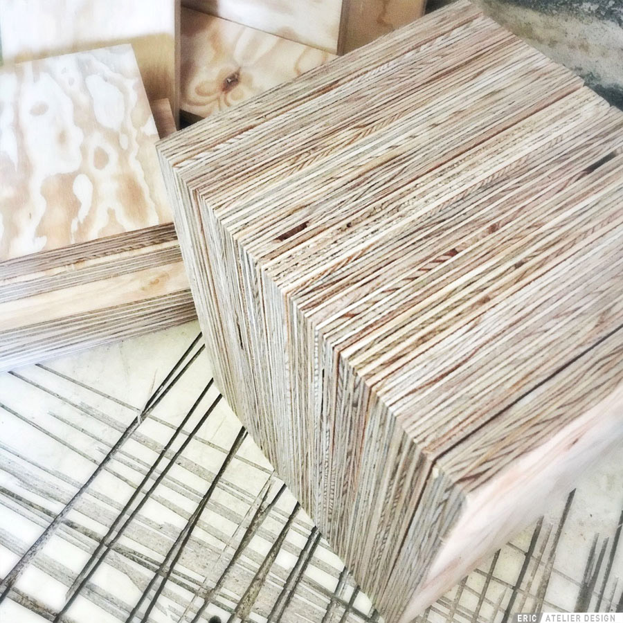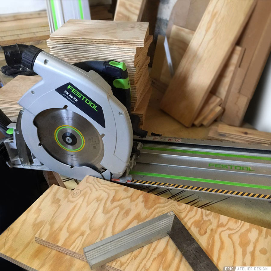 l'ensemble du mobilier est réalisé à l'atelier d'après les plans 3D, à partir de matériaux bruts issus de fournisseurs locaux. L'usage de plots de bois de scierie permet de réaliser les panneaux en bois massif supérieurs à 2m non aboutés (sans raccord).