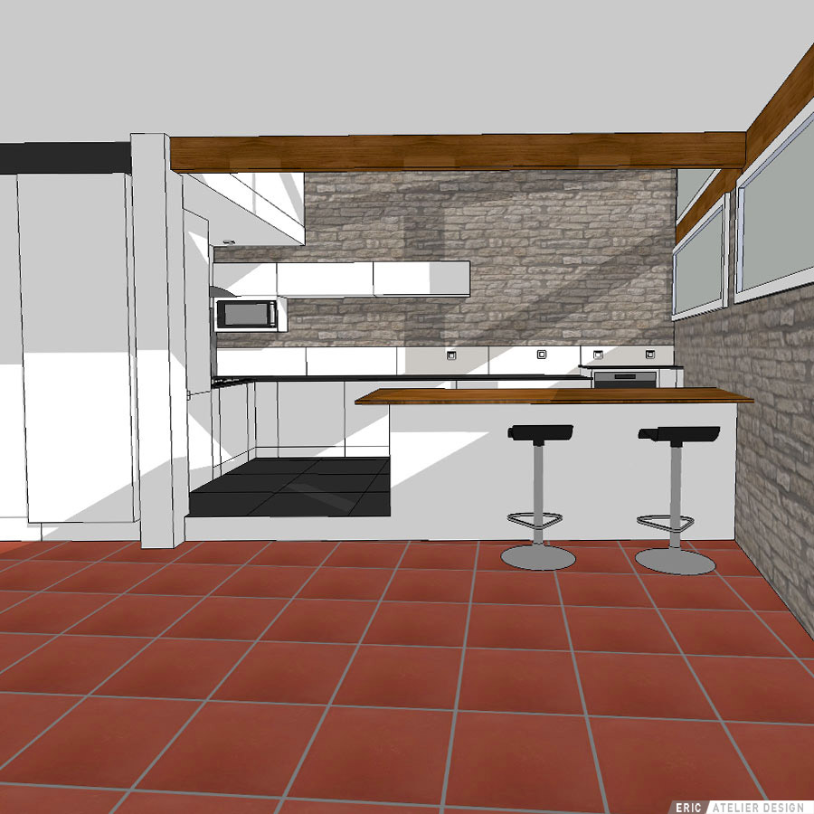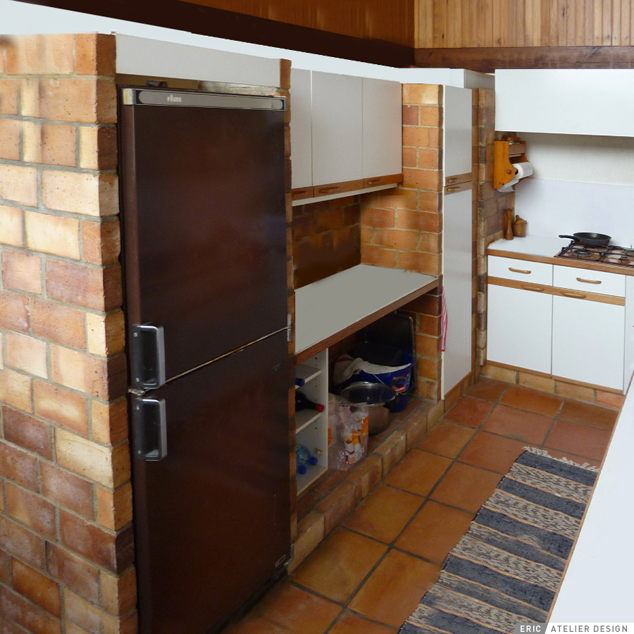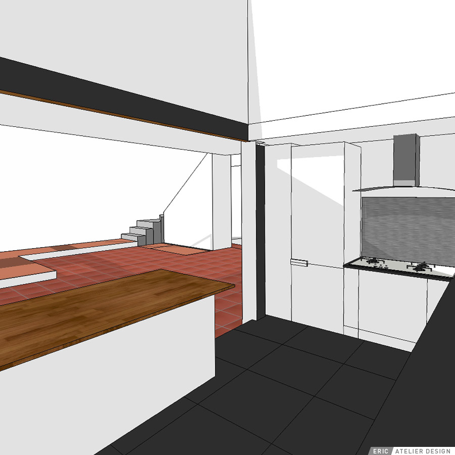 Jusqu'à là fermée par un imposant mur en brique, gênant pour la circulation et l'apport de lumière, la cuisine existante avait besoin d'un rafraichissement. Le projet prévoit une communication visuelle avec l'espace séjour, l'ajout d'un ilôt, et de nouveaux équipements.