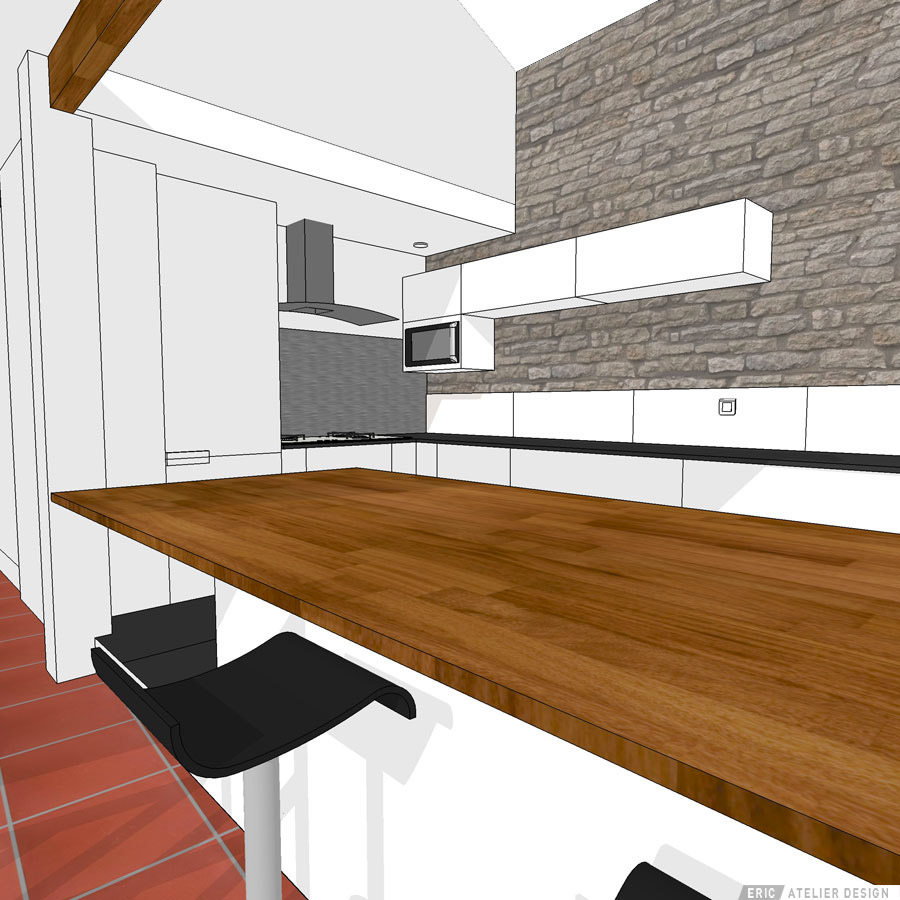 Enfin, étant donné l'usage détente de cette habitation, et le goût de cette famille pour les préparations culinaires, je propose d'augmenter la taille initiale de l'ilôt à 2,20m x 80cm, avec un débord vers le séjour, permettant un usage bar, préparation et un espace suffisant pour les ustensiles. Un plan bar plus chaleureux est sélectionné en chêne massif, avec la particularité d'être non abouté, c'est à dire composé de lames de bois toute longueur, ce qui donne un interêt esthétique à l'ensemble.