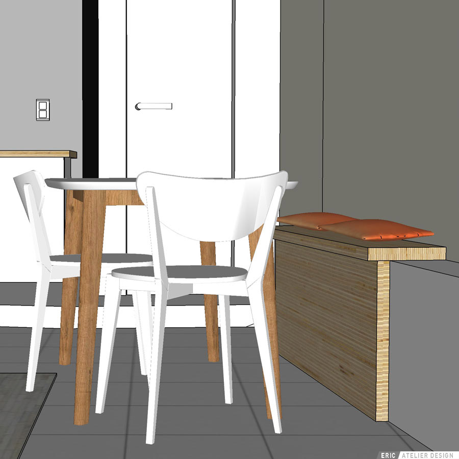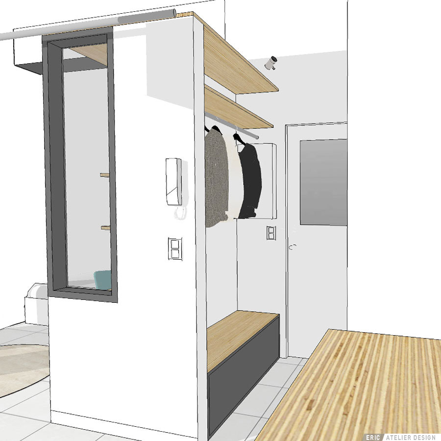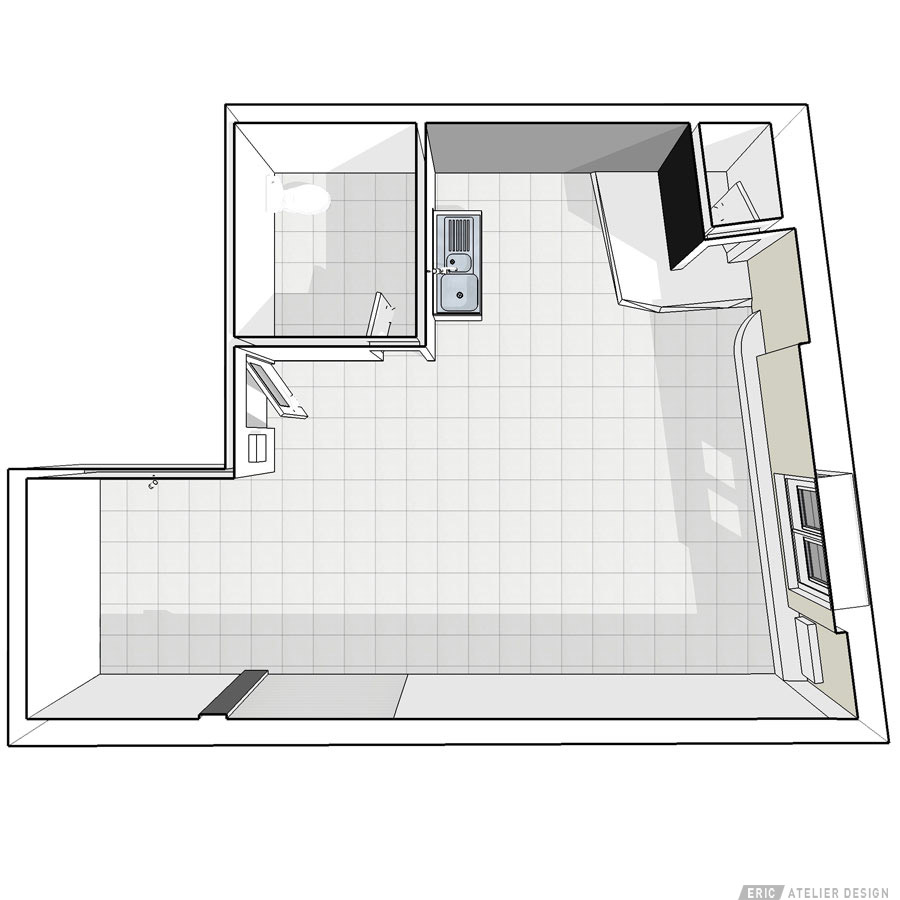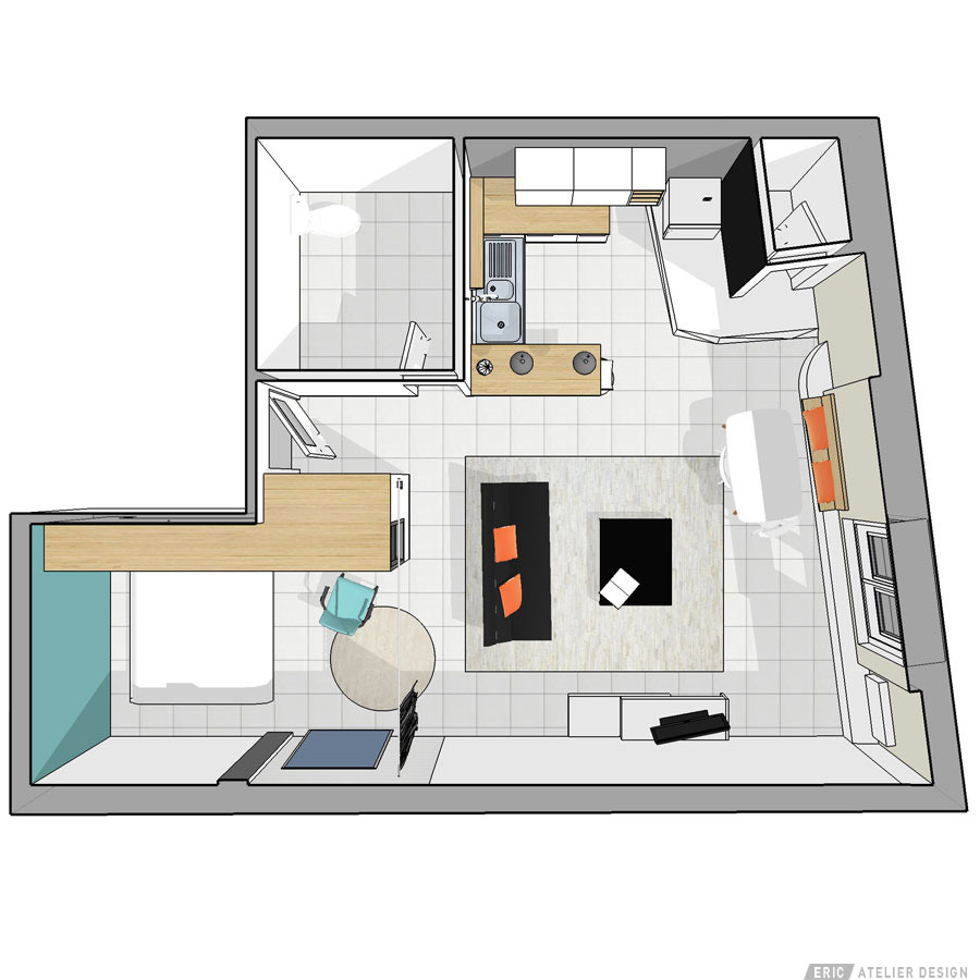 Le propriétaire de cet appartement dispose d'un plateau de 40m2 qu'il souhaite aménager pour un projet locatif. En terme d'équipements, l'espace dispose d'un coin cuisine minimaliste et d'une salle d'eau fermée. Ma mission est d'imaginer une solution pour créer un espace nuit isolé, un aménagement de cuisine plus confortable, tous les rangements utiles à l'occupation d'un studio, les points lumineux suffisants, tout en réchauffant l'ambiance du lieu. L'aspect financier implique de trouver des solutions simples et économiques, sans poste de gros œuvre.