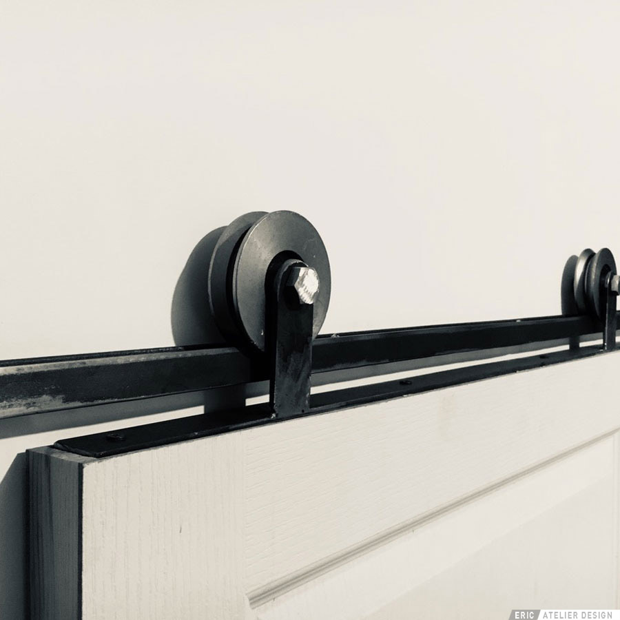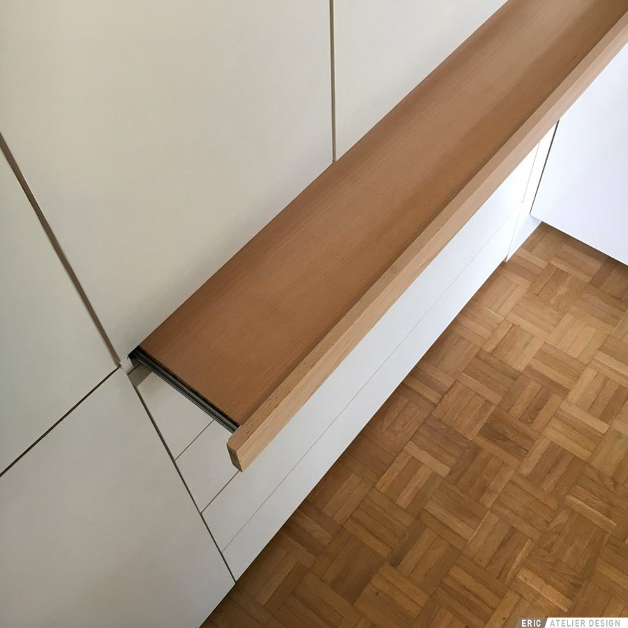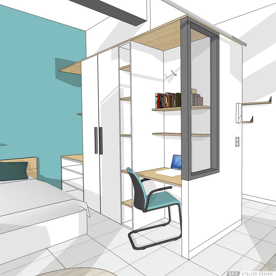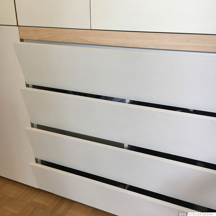 Une nouvelle option est apparu en cours de projet : la porte de la chambre vient à présent s'intégrer dans le fond du meuble à la façon d'un système à galandage que je réalise avec des poulies industrielles, et disparait ainsi totalement en position ouverte. Une console vient compléter le volumes avec quatre grands tiroirs, derrière lesquels une niche est équipée de tablettes et patères pour les ceintures et foulard...