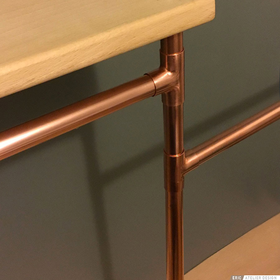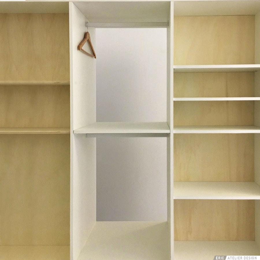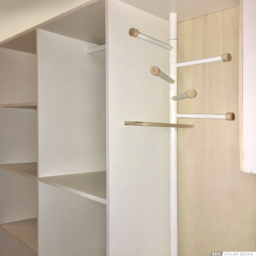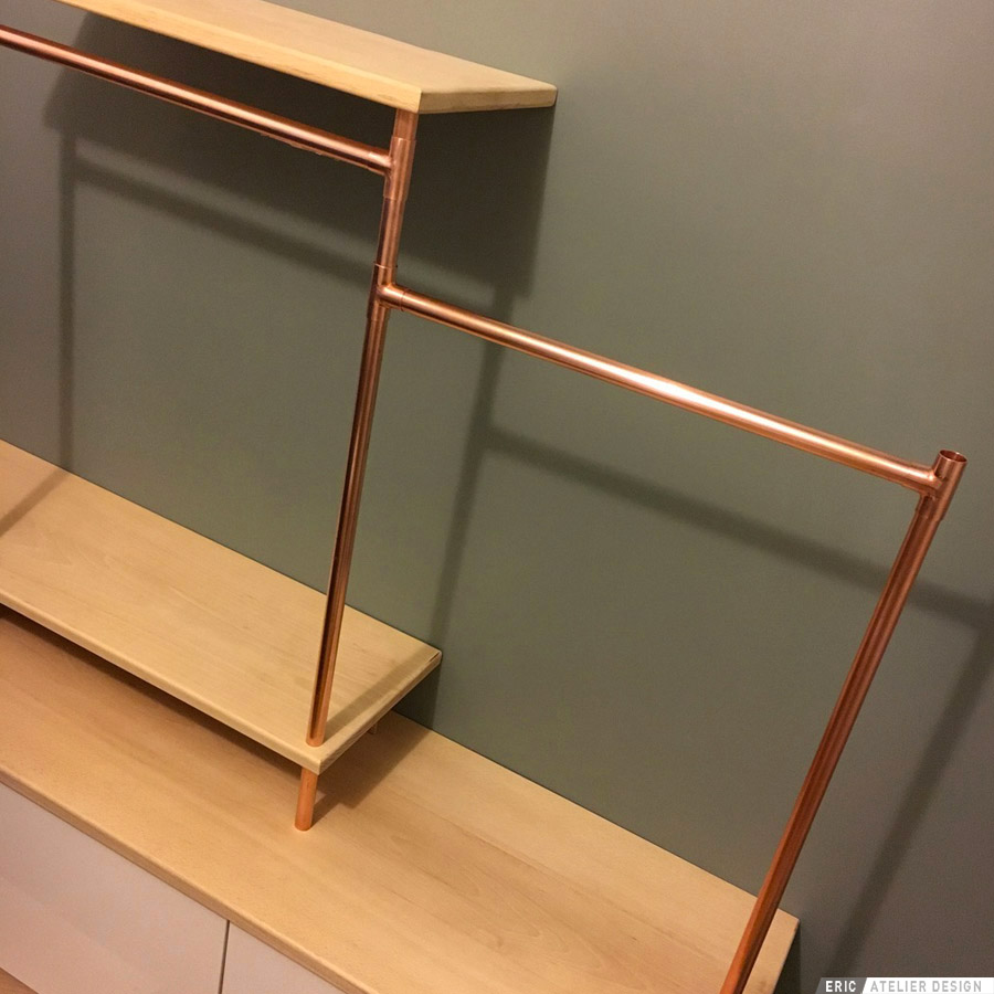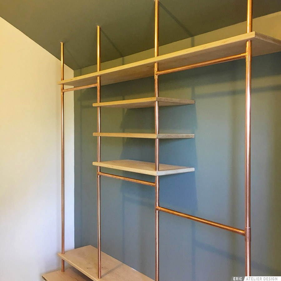 La partie dressing, totalement ouverte, profite de toute la hauteur disponible. Elle est composé de quatre penderies de differentes hauteurs, en tubes de cuivre renforcés, traversant les tablettes en hêtre massif, sans aucune fixation visible grâce à un système d'assemblage fait maison. En partie basse, trois caissons fermés aux façades laquées sont suspendues pour aérer l'ensemble. Pour une question d'économie de place, la profondeur hors-tout du module complet est inférieur à 45cm.