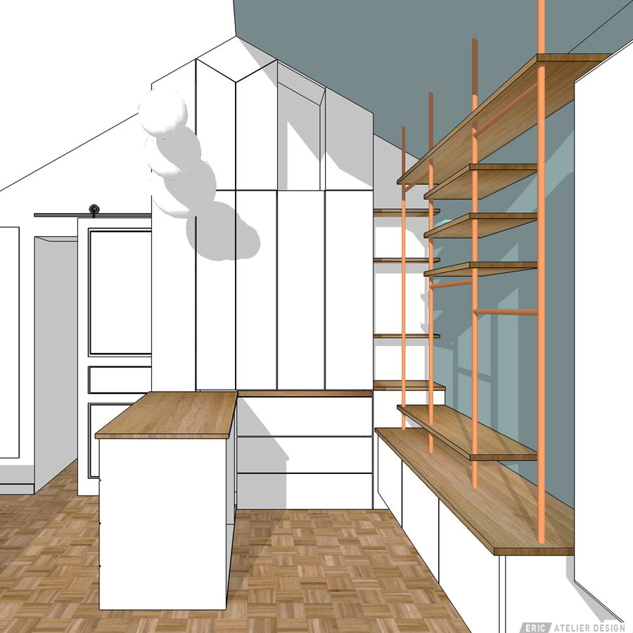 Les volumes nécessaires pour les effets de deux personnes prennent forme dans plusieurs modules sur-mesure : un dressing ouvert et un mur de rangement en faible profondeur. L’illustration de l’intention est présentée sur logiciel 3D, permettant d'identifier certains détails à ajuster, et d'établir les côtes précises pour la fabrication. L'ensemble du projet est arrêté et précisément chiffré.