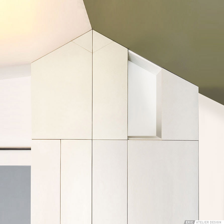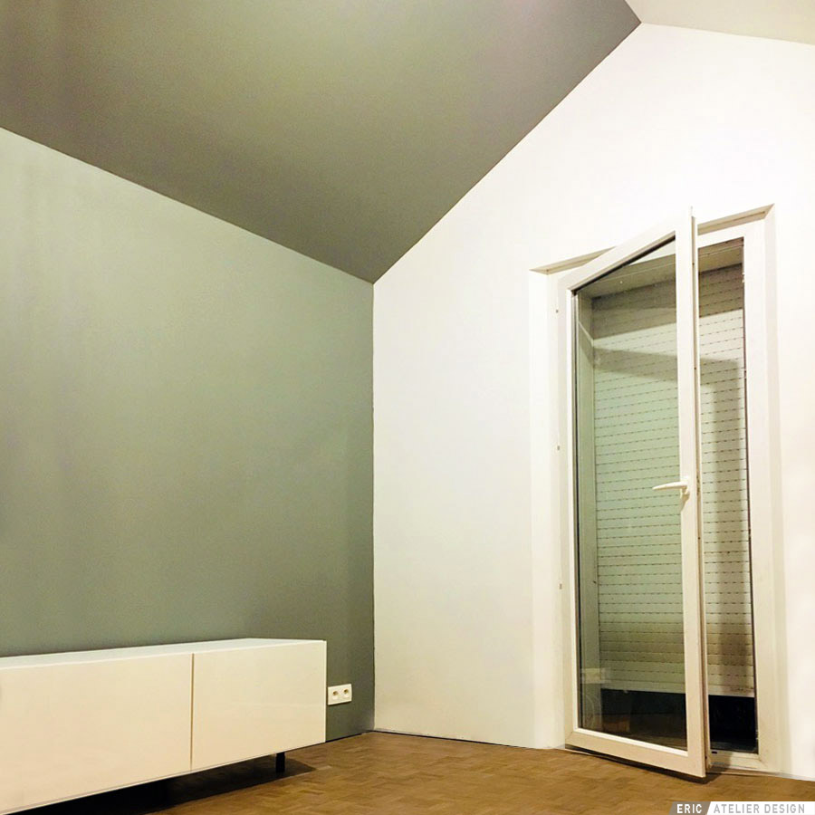 Pour ce projet, la demande est ambitieuse : intégrer un dressing et de nombreux rangements fermés dans une chambre parentale sous pente de 14 m2, dont seulement 10 m2 en loi Carrez (hauteur sous plafond supérieure à 1,80 m).