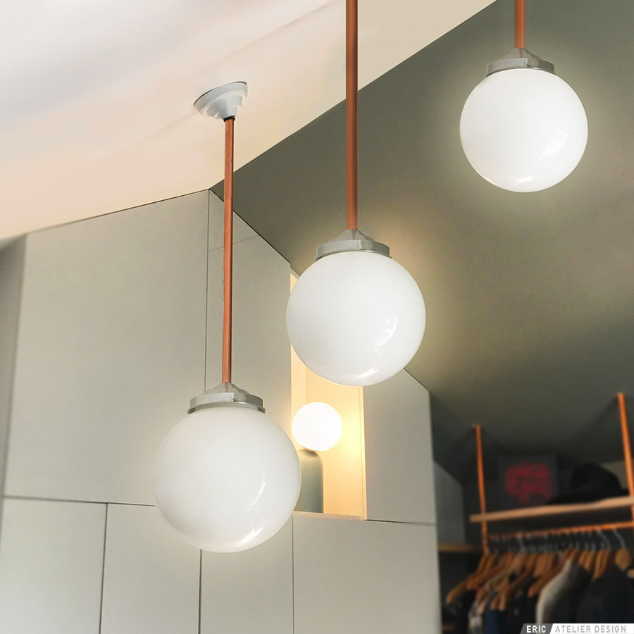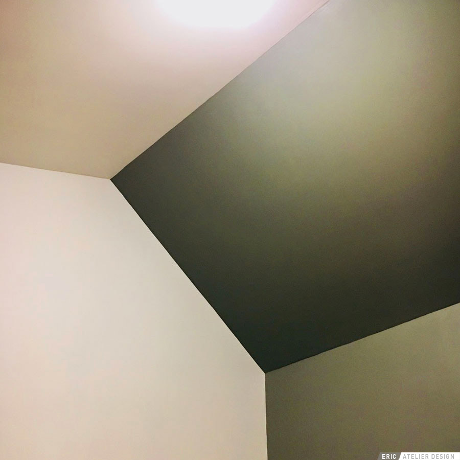 La finition de l'ensemble des murs de la chambre est traité en blanc chaud, une peinture acrylique "Castle White" satin velours, dans la gamme Seigneurie Gauthier. Le cahier des charges prévoit l'utilisation d'un vert mat de la gamme Farrow & Ball. La teinte est appliquée sur le mur du dressing ET sur un pan de plafond, ce qui crée un contraste fort et délimite parfaitement l'espace. L'espace est complété par l’ambiance lumineuse, une arrivée électrique est prévue pour une lampe de créateur, quivient se loger dans une niche ouverte en hauteur. L'éclairage principal est assuré par trois globes en verre que je modifie en les montant sur des axes en cuivre assorti au mobilier.