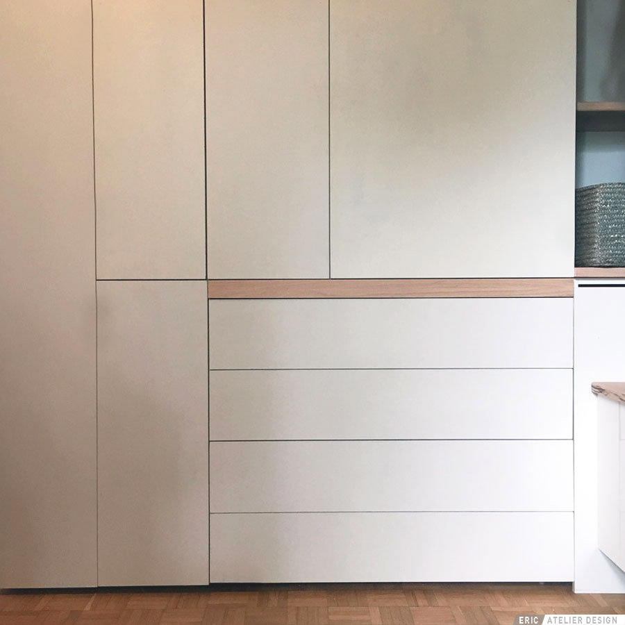 Pour ce projet, j'accompagne les clients dans la composition des meubles selon le cahier des charges que nous avons élaboré. De multiples options de meubles, accessoires, rangements sont envisageables dans un dressing. L'ensemble est synthétisé sur plan et les références détaillées pour la commande auprès du fournisseur qu'ils ont choisi.