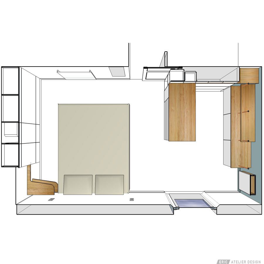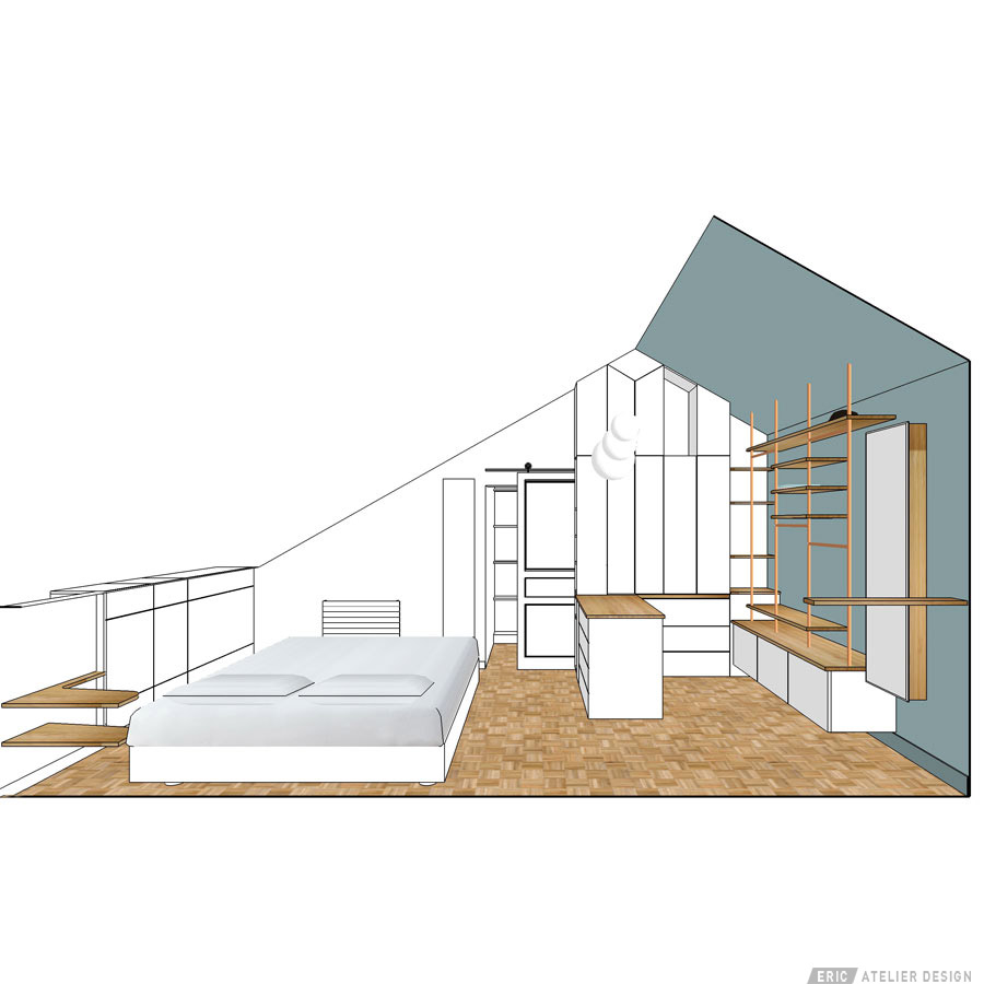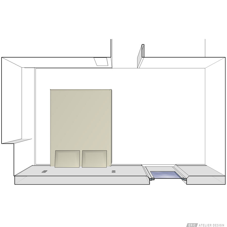 Après l'étude de plusieurs axes d'aménagement, la proposition retenue définit la zone nuit en partie basse de la pièce, laissant davantage de lumière dans le reste de la pièce, et un maximum de hauteur que nous allons totalement exploiter en rangements.